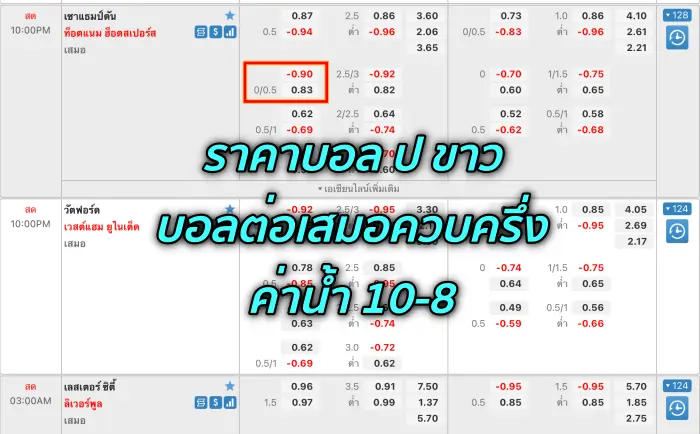 มาในค่าน้ำ ขาว ถ้าท่านเล่นทีมต่อ อย่างที่บอกไปว่า 10-8 คือ แทง 10 ได้แค่ 8 เท่ากับว่าถ้าแทงแค่ 500 แล้วชนะก็จะได้แค่ 400 เท่านั้น ส่วนทีมรองนั้นได้เต็มเสียเต็มทุกกรณี
