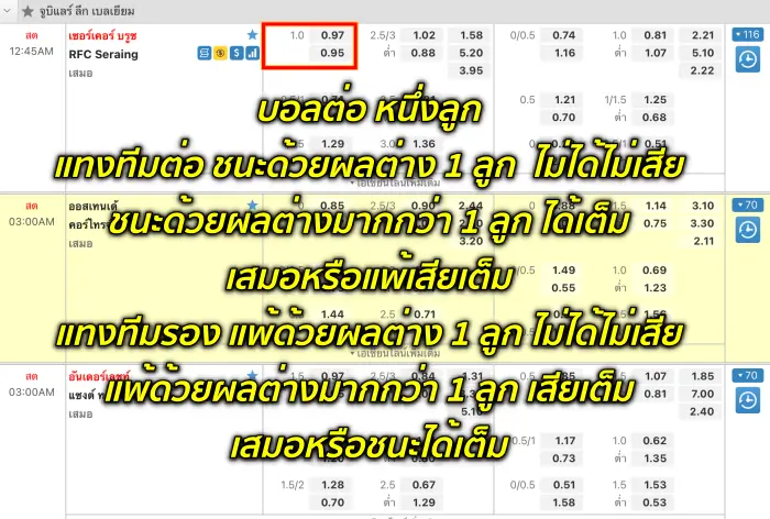 - วางเดิมพันทีมต่อ ชนะ ด้วยผลต่าง 1 ลูก เจ๊ากันไป ชนะ ด้วยผลต่างมากกว่า 1 ลูก ได้เงินเต็ม เสมอหรือว่าแพ้ก็เสียเงิน